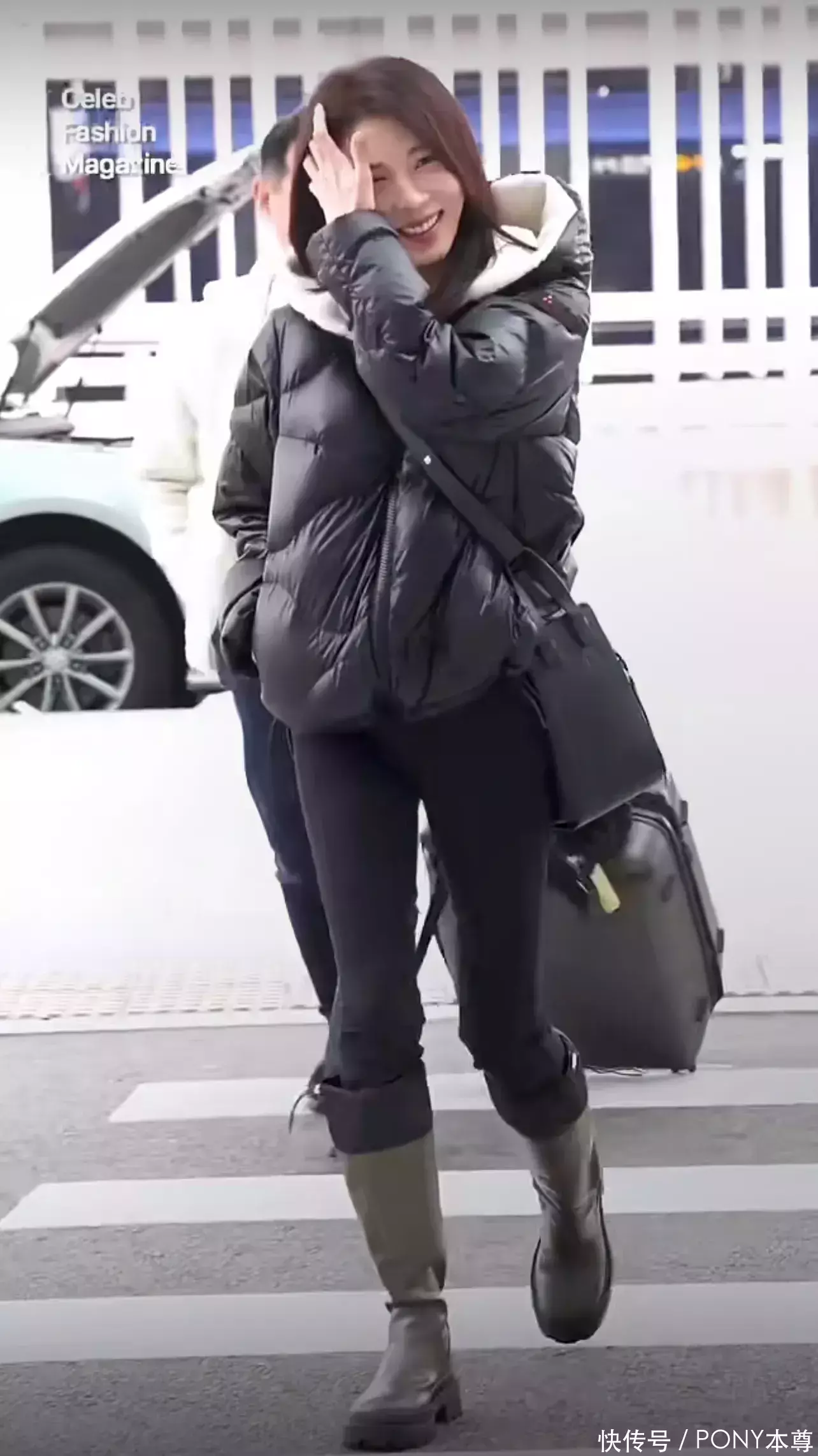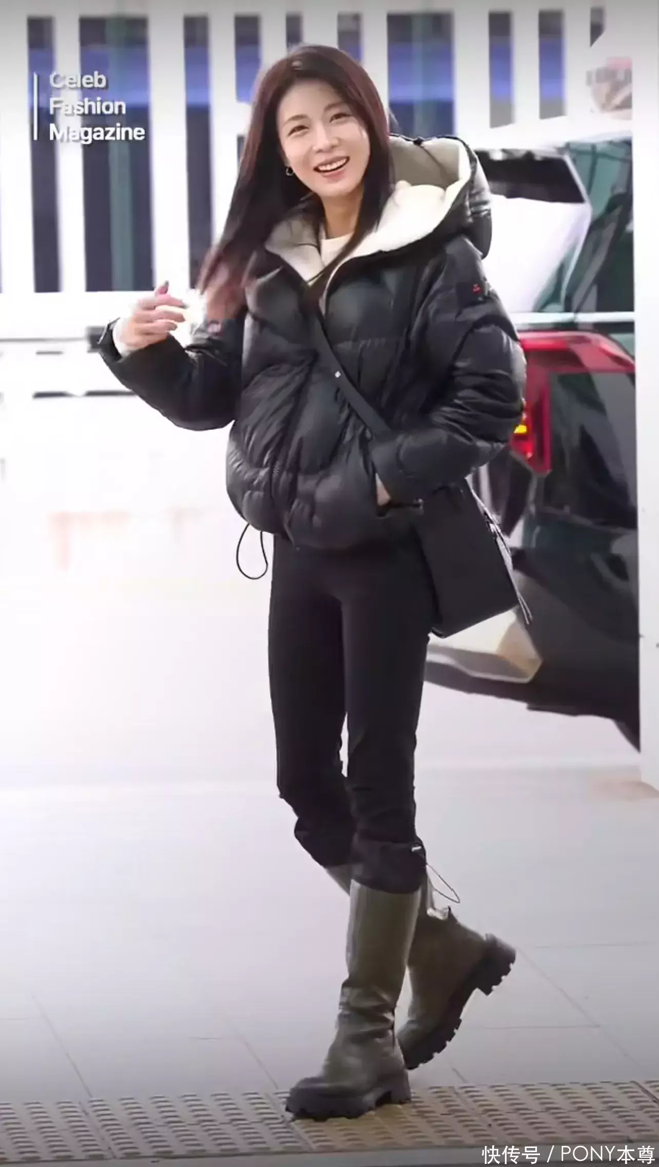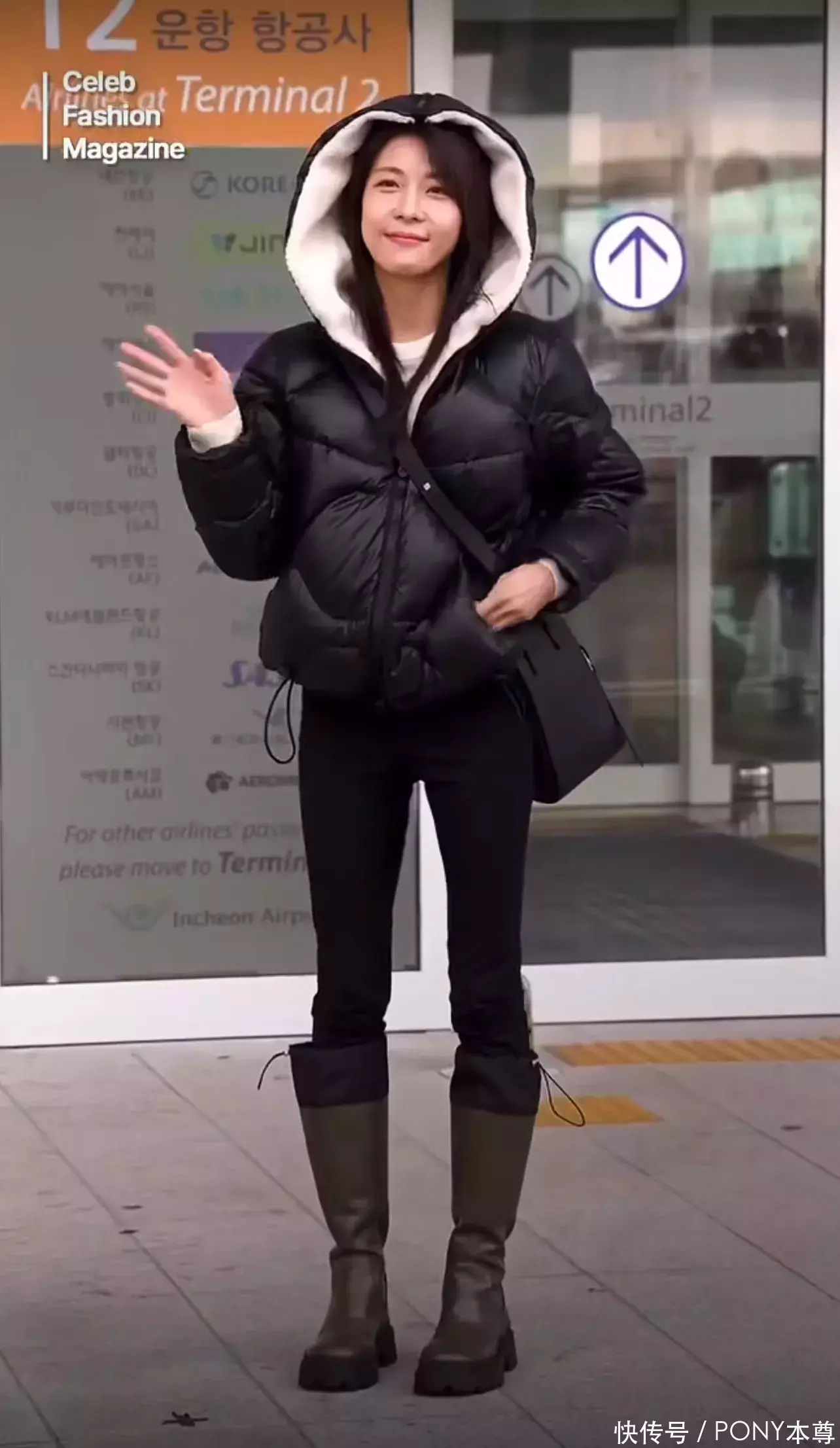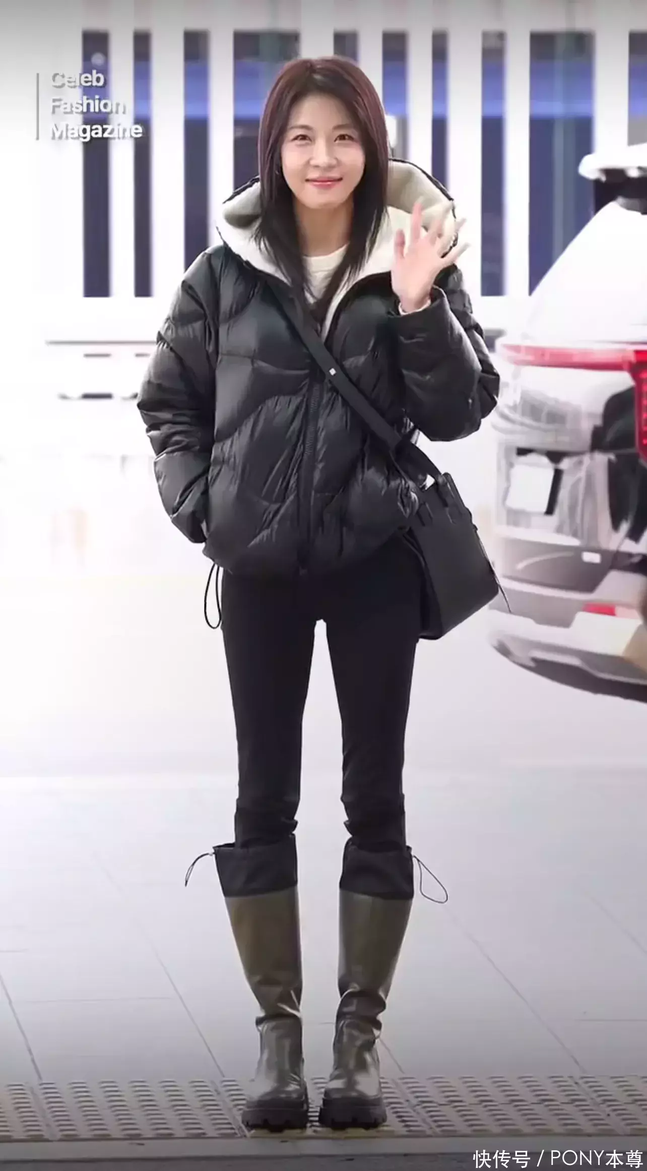 下半身搭配的黑色紧身牛仔裤,更是将 “显腿长” 的优势发挥到极致,贴合腿部线条的设计勾勒出纤细腿型,与短款羽绒服形成 “上短下长” 的黄金比例,视觉上进一步拉长身形,让 168cm 的河智苑看上去愈发高挑。